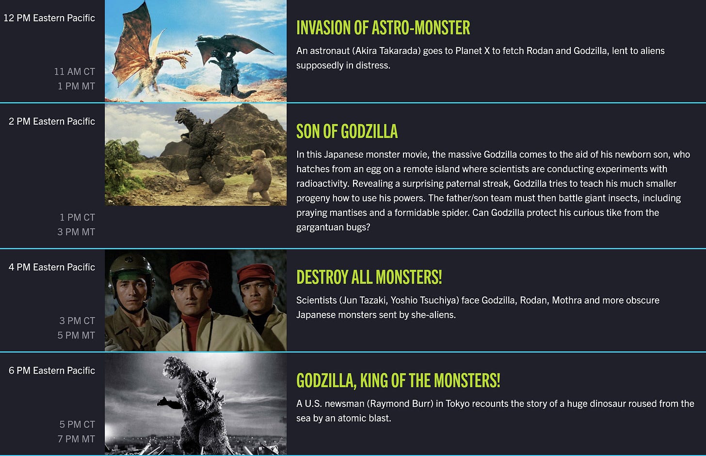 On Sunday, April 28, 2024, Comet will be airing another of their Godzilla marathons, with several of the usual films. Whether their timing is intentional or not, GODZILLA, KING OF THE MONSTERS! premiered in American theatres on April 27, 1956.