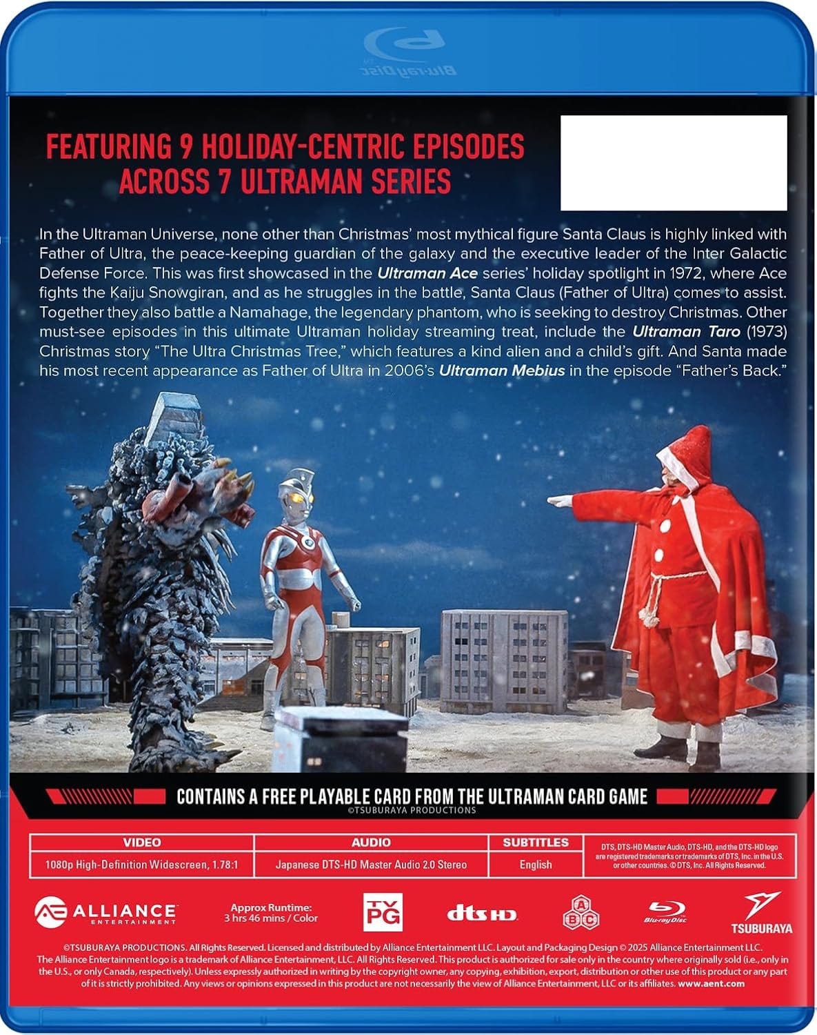 In a fun and festive first for the Ultra series, Alliance Home Entertainment (formerly Mill Creek Entertainment) will be releasing a holiday-themed Blu-ray on 12/09/25, titled the “Ultraman Yuletide Collection”. This set contains nine episodes from across seven Ultra series. Conflicting sources state this is either a one or two disc set. As with most recent Ultra Blu-rays, it comes with a free playable card from the Ultraman Card Game.